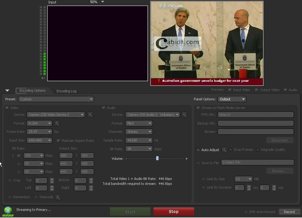 common encoding parameters like those used for this page's Flash stream...note the "Total bandwidth required to stream" info - that's the upload speed required on-site to the server, whereas the "Bit Rate" is the bandwidth the Viewer needs to download the live stream. |